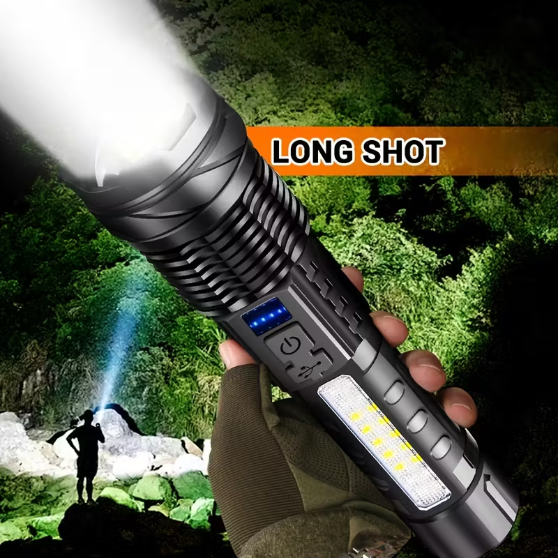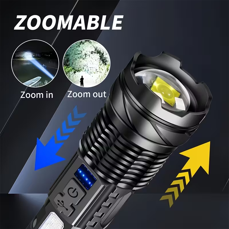 1/2/4 unidades Lanterna LED de Alta Potência com Luz Lateral de Aviso COB Vermelha/Azul | Luz Recarregável Zoomável de Longa Distância para Pesca e Campismo, Múltiplos Modos, Cabo USB, Bateria de Lítio, Portátil e Conveniente