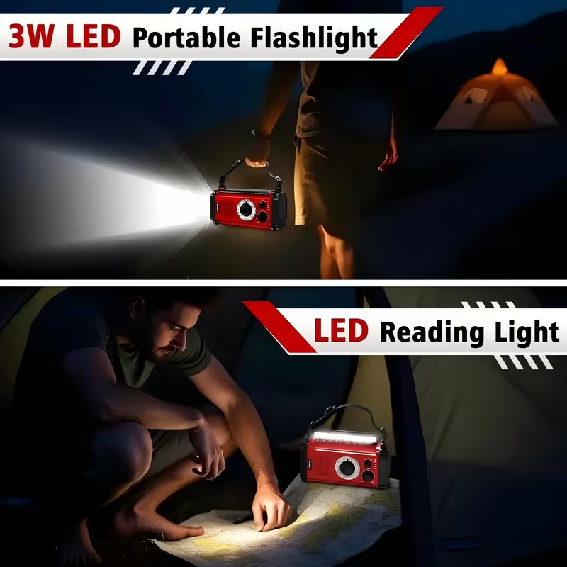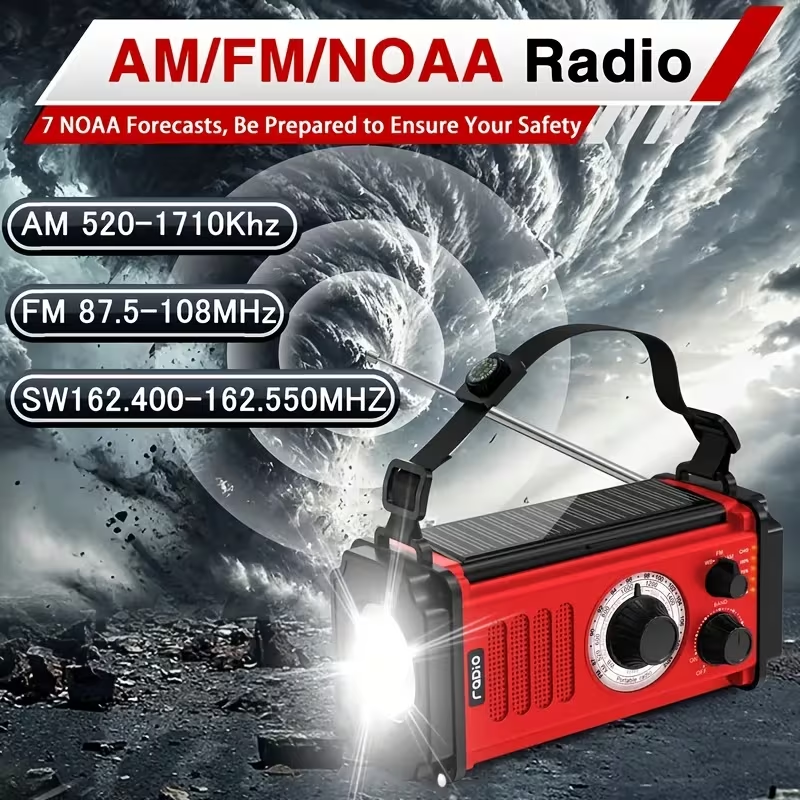 Rádios de Emergência, Rádios de Manivela, Rádios de Energia Solar, Rádios Meteorológicos AM FM NOAA, Cinco Métodos de Carregamento, Lanterna e Luz de Leitura LED, Alarme SOS de Emergência para Tempestades e Desastres Sazonais.